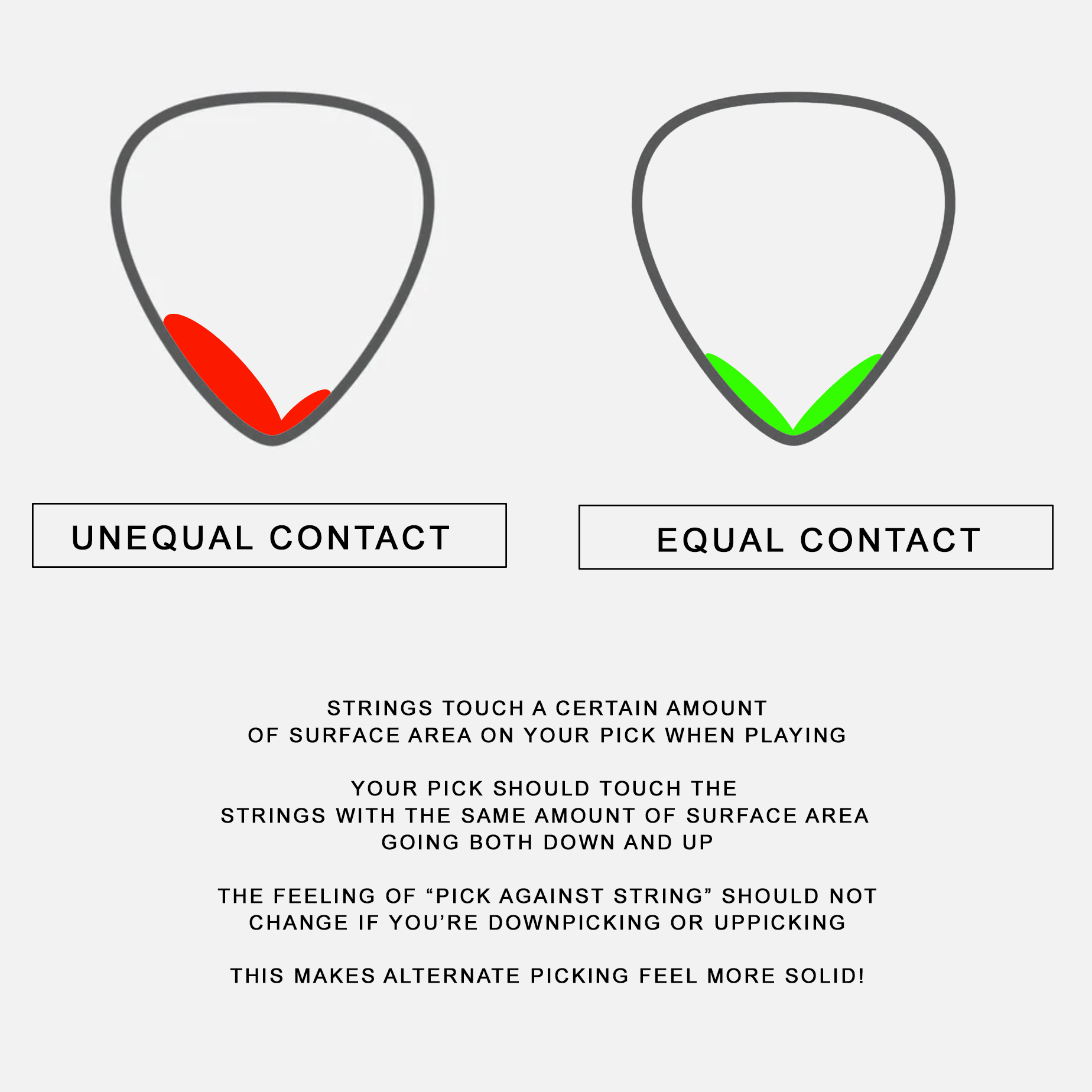 You maintain consistent down-up-down-up motions. Your pick doesn’t strike the string before your fingers land on the fret. Your pick cuts easily through the string, and you can stretch all four fingers across a four-fret distance while keeping a straight wrist.
